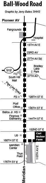 Over the years Meridian Avenue has been known by a number of names: Ball-Wood Road, Puyallup-Graham Road, Meridian Street Extension, Farm-to-Market Road, and probably others. But Ball-Wood Road was the first and thus the historic name.